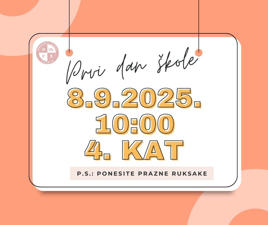 Dragi učenici, poštovani roditelji, stiglo je vrijeme prvog dana školske 2025./2026. godine! Učenici svih razreda moraju doći u ponedjeljak 8. rujna 2025. u 10:00 na 4. kat gdje će ih dočekati razrednici. Nakon uvodnog govora ravnateljice, zajedno sa svojim razrednicima uputit će se u svoje učionice gdje će imati prvi sat razrednog odjela. Bitno je …